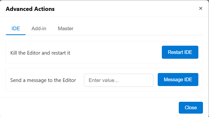 Opens the advanced actions dialog for system-level operations.