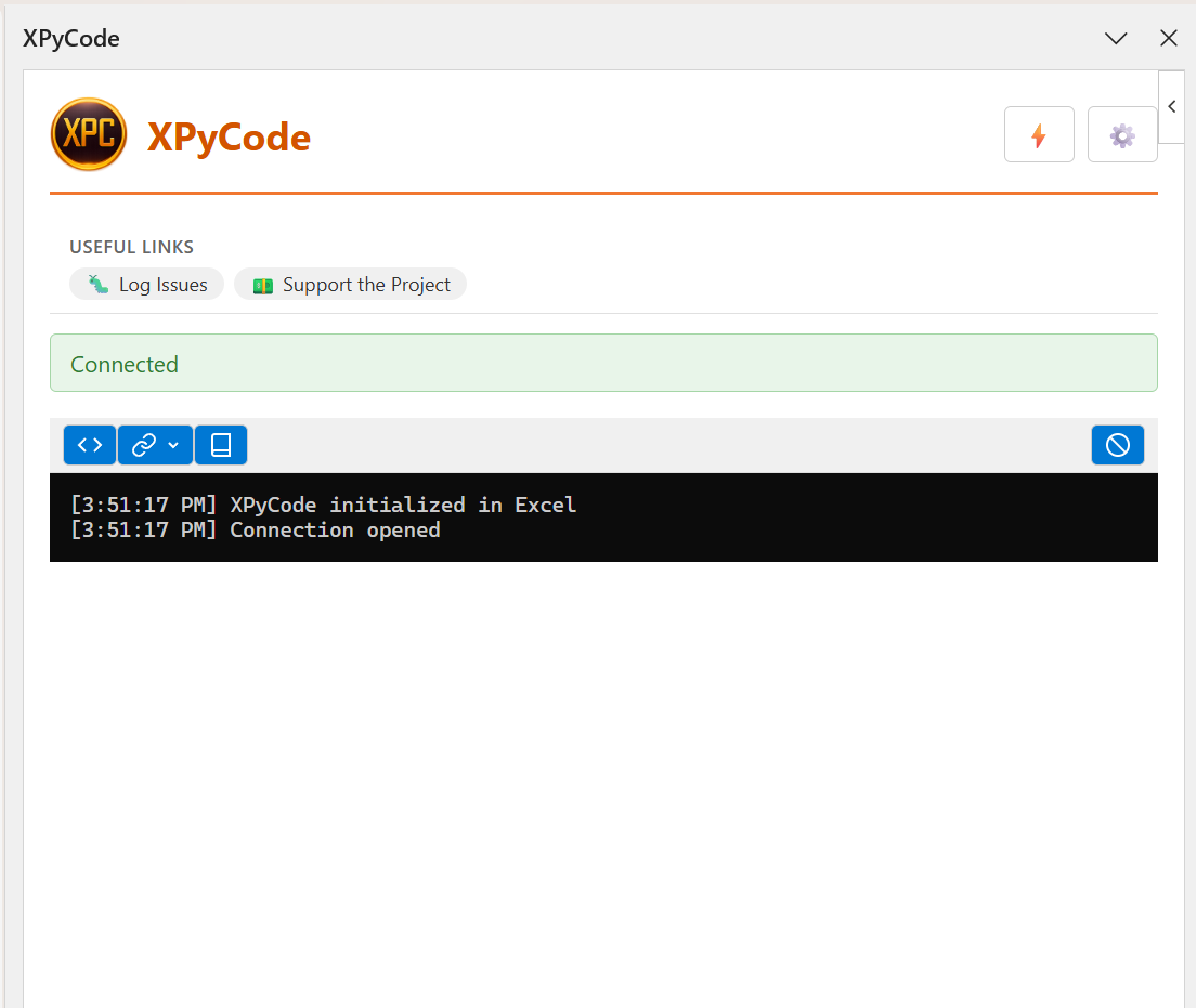 The XPyCode Taskpane is the main interface for interacting with Python in Excel. It provides quick access to essential features, displays real-time console output, and allows you to manage your XPyCode environment.
